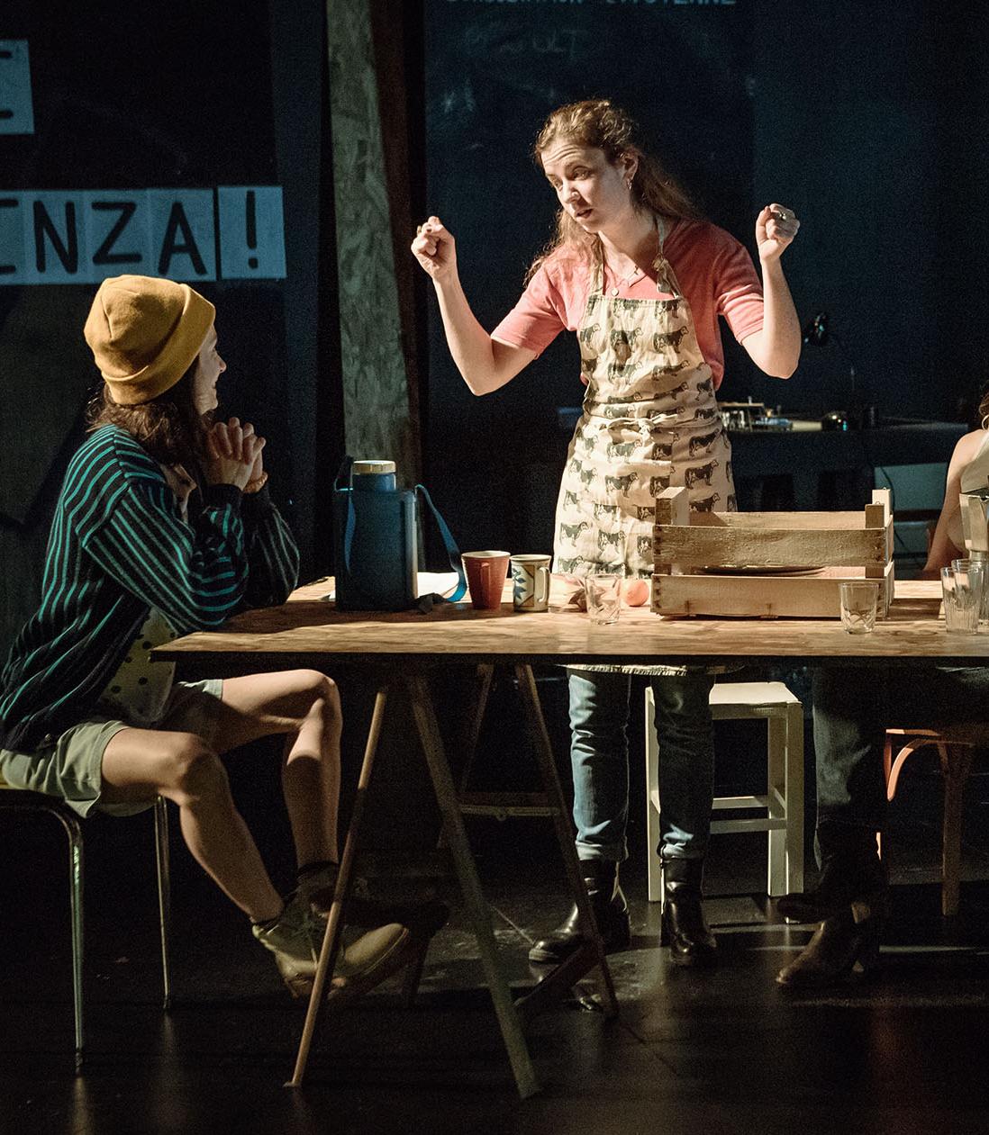 Mai 2026. La municipalité a décidé de raser le Théâtre Antoine Vitez dans la perspective de redessiner le centre-ville en livrant le terrain aux appétits privés. Une poignée de jeunes gens, un collectif d'artistes, refuse de laisser ce lieu aux mains de promoteurs et décide d'occuper le théâtre. Ils débarquent sur scène par les gradins avec leurs affaires et cartons à pizza, et occupent le lieu en temps réel. Le public se retrouve embarqué dans une lutte collective, sans trop lui laisser le choix ! Le texte est inclusif et littéraire, tantôt braillé tantôt chanté avec délice en italien, et la troupe se paie même le luxe de corriger Bertolt Brecht.